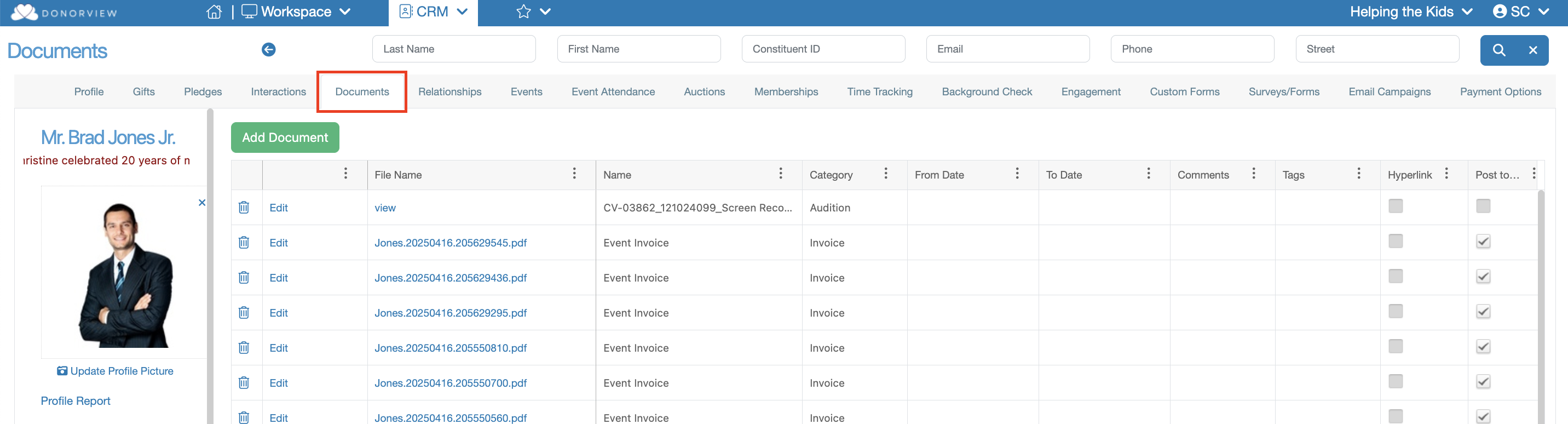 From the main Documents grid, you can use the search box or filters to find the constituent. Click on the row for the constituent, then the View/Edit button and then Documents.